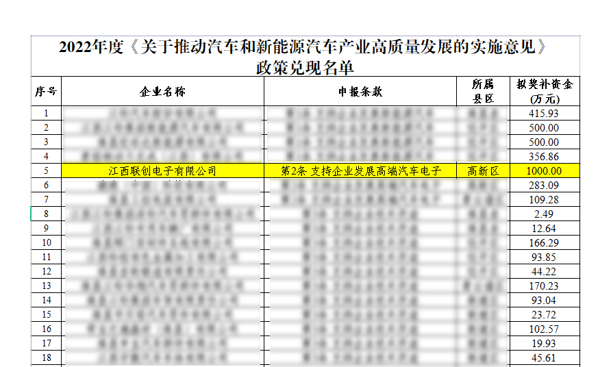 为抢抓新一轮新能源汽车产业发展机遇,加快建设具有南昌特色的现代化产业体系,2023年12月,2022年度《关于推动汽车和新能源汽车产业高质量发展的实施意见》政策拟兑现名单公示,江西联创电子有限公司榜上有名,获得发展高端汽车电子1000万元奖补资金,成为南昌市唯一一家获顶额奖补的企业。